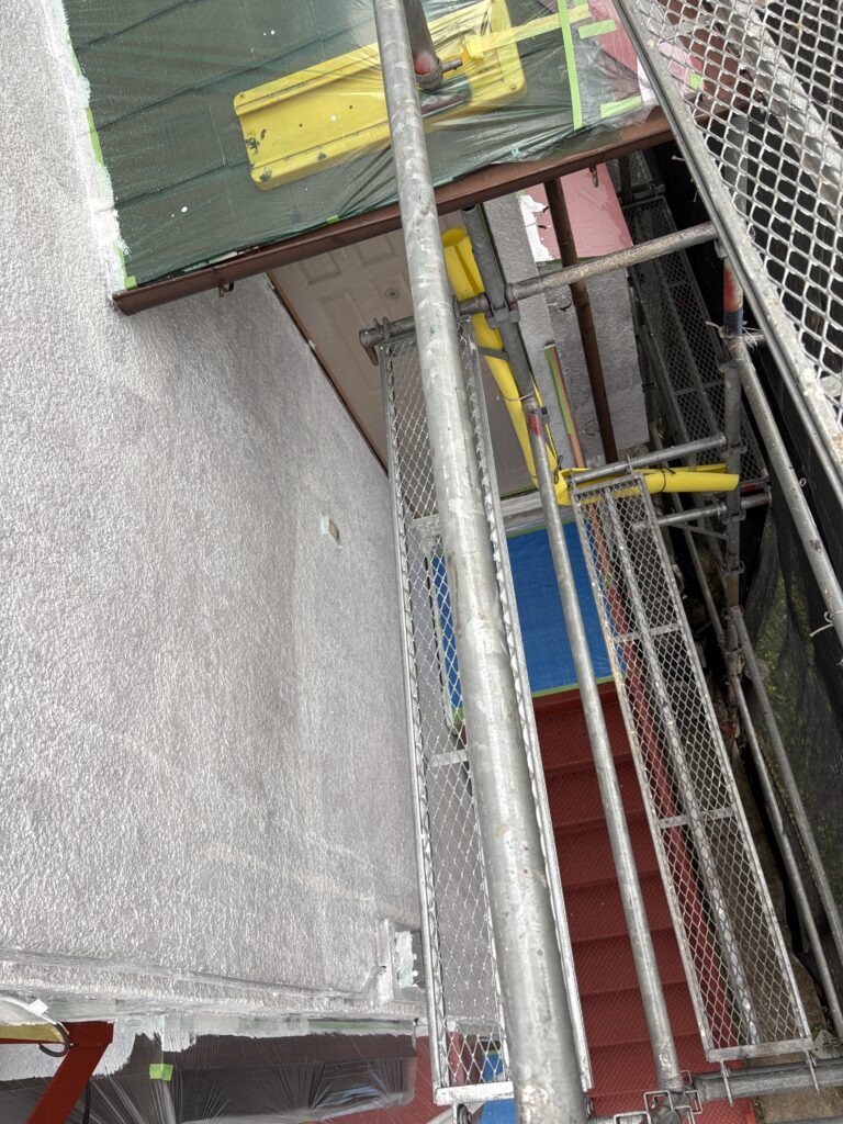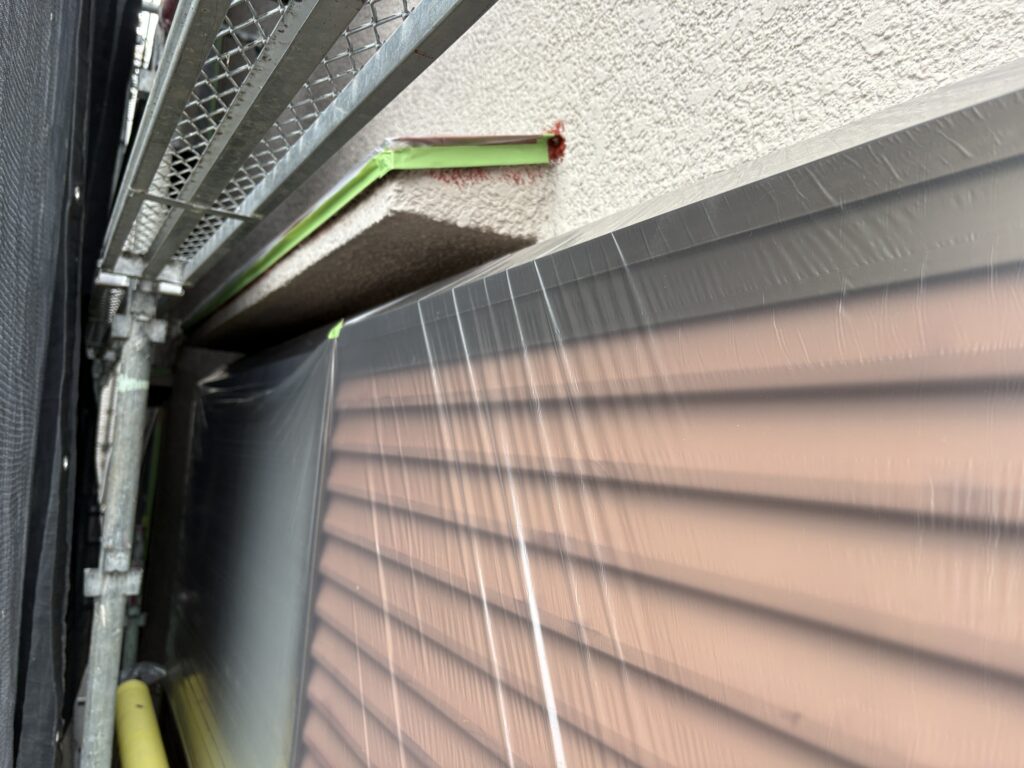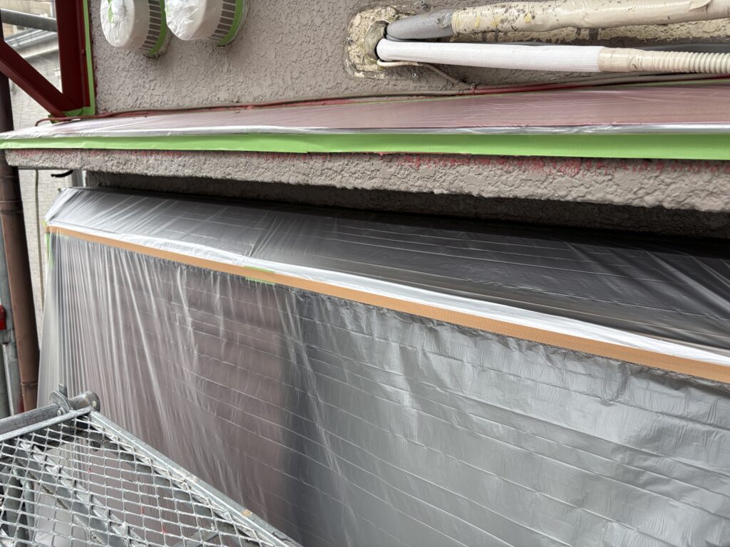 S様邸本日の作業内容は、各養生(塗装しなない部分をビニールで保護する)を行い